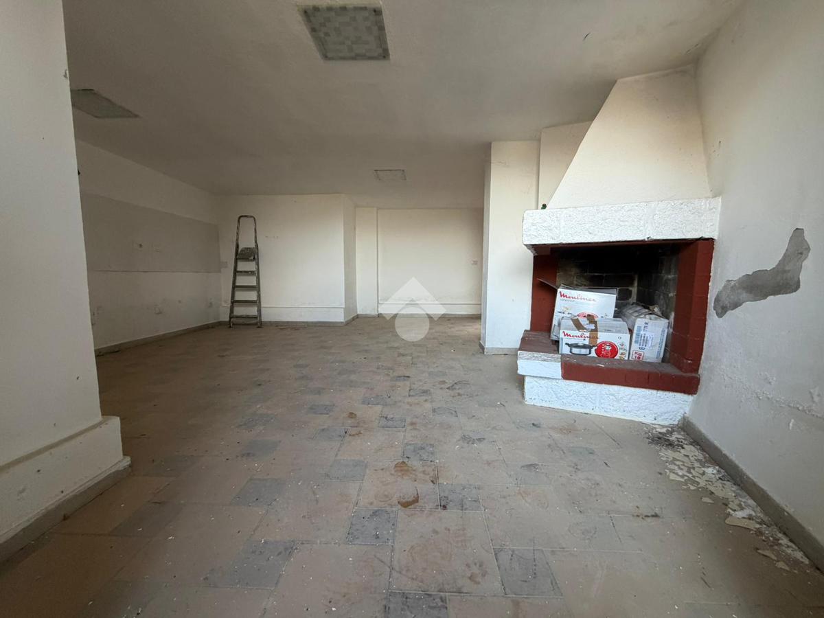 L’ingresso si apre su un’accogliente zona giorno open space con salone e cucina a vista, resa calda e familiare dalla presenza del camino.